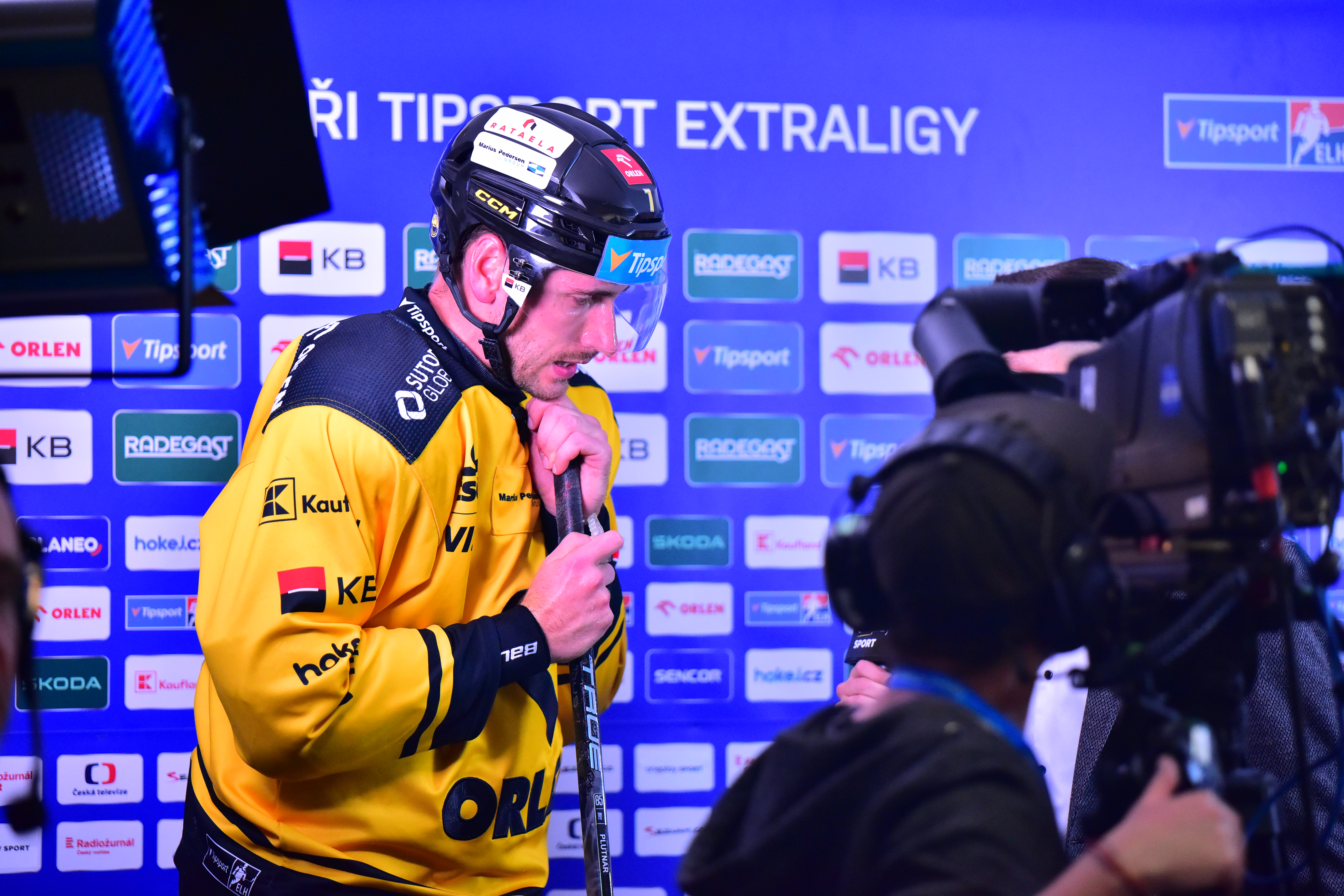 Předsezonní posila Michal Plutnar při televizním rozhovoru při utkání se Spartou, foto: Matyáš Rjabi